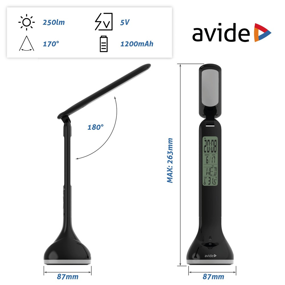 Az Avide LED Asztali Lámpa RGB Hangulatvilágítással modern és praktikus világítási megoldás otthonra vagy irodába. A 4W teljesítményű, energiatakarékos LED fényforrás 250 lumen fényerőt biztosít, miközben a beépített RGB hangulatvilágítás különleges atmoszférát teremt bármilyen környezetben. Az érintésvezérlő panelnek és a beépített akkumulátornak köszönhetően kényelmesen használható, a minimalista fekete design pedig könnyen illeszkedik bármely enteriőrbe. Emellett a lámpa beépített naptár funkcióval is rendelkezik, így mindig nyomon követheted az időt és a dátumot. A könnyen kezelhető kapcsolóval és állítható nyak segítségével könnyedén irányíthatod a fényt a kívánt irányba. Az Avide LED Asztali Lámpa RGB Naptár Fekete 4W tökéletes választás a praktikus és stílusos világításért.