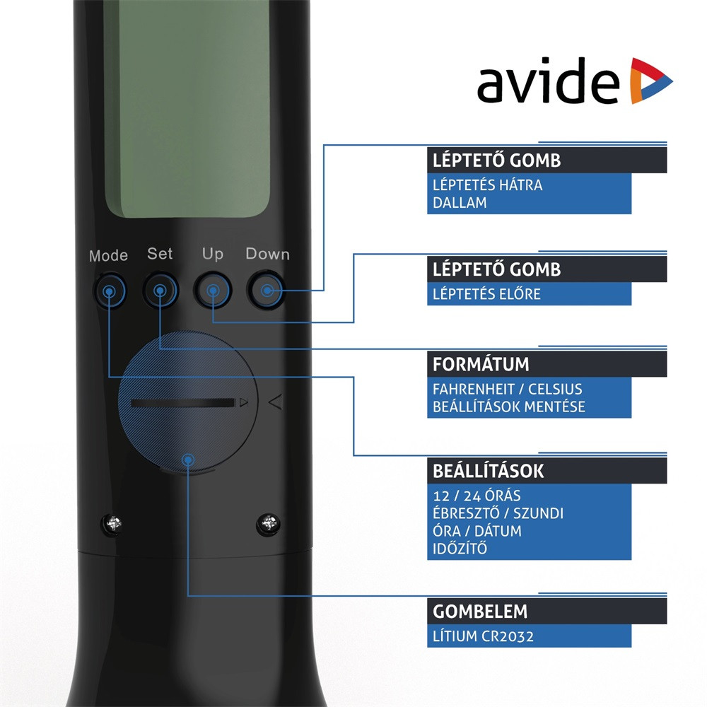 beépített LCD kijelző: Óra, Ébresztőóra, Naptár, Hőmérséklet funkcióval
