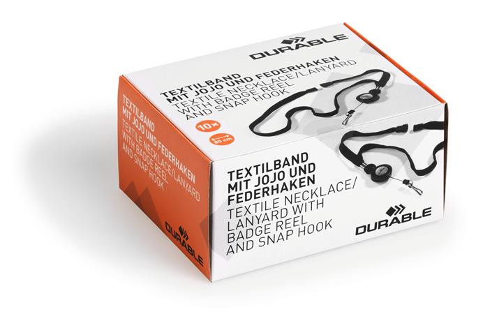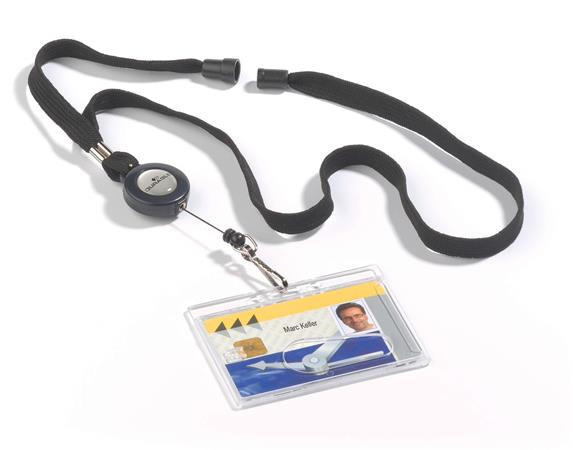 Biztonsági kioldóval ellátott nyakba akasztható textil szalag, kihúzható tartóval.