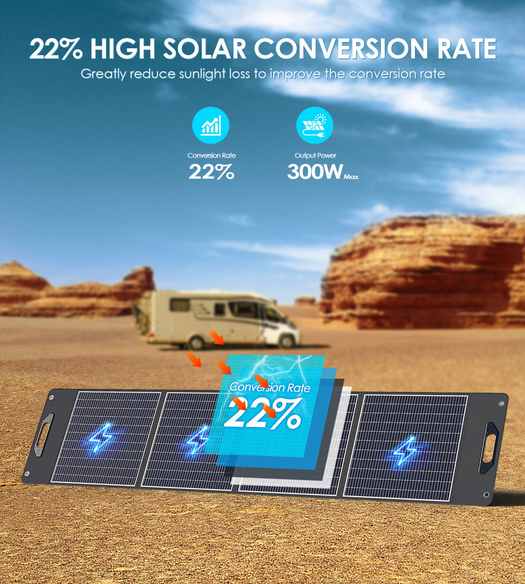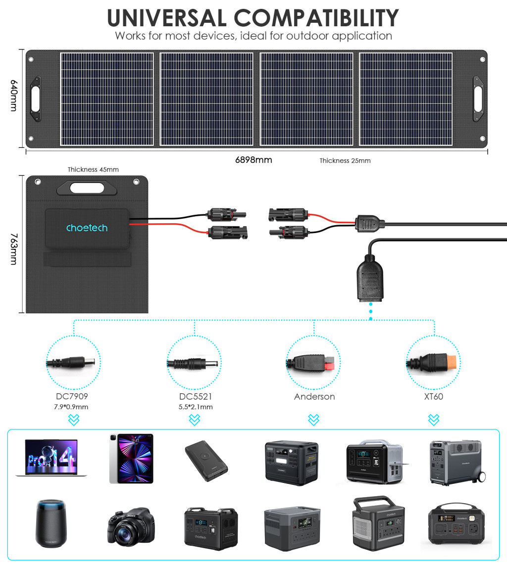 SC016 * Szín: Fekete * Anyag: EVA, szilikon, nylon * Vízállóság: IPX4 * Interfész: MC4 * Kimeneti teljesítmény: * 39V/10,25A * Maximális teljesítmény: 300W * Tanúsítványok: CE, FCC, RoHs