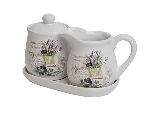 Cukortartó és tejszínkiöntő szett+alj, levendula mintás