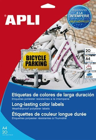 Etikett, 210x297 mm, poliészter, időjárásálló, APLI, sárga, 20 etikett/csomag