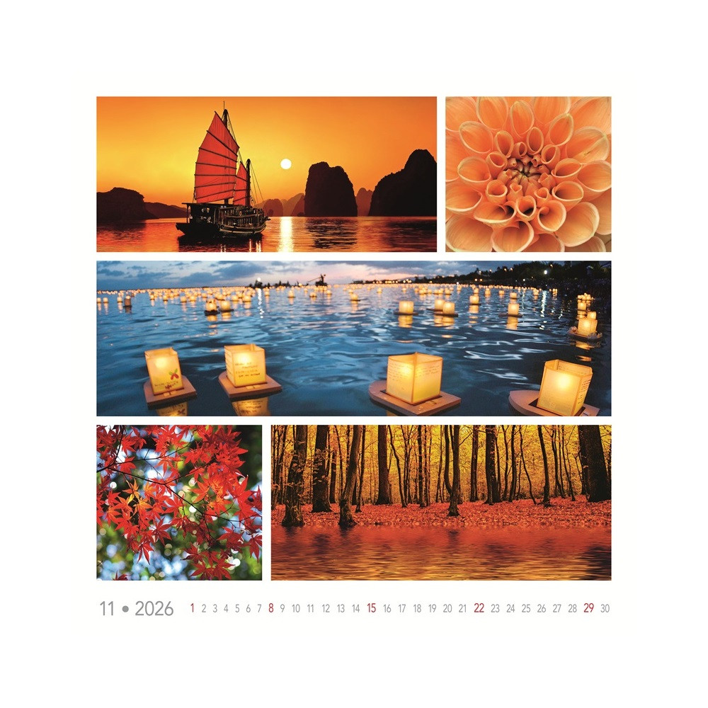 • A naptár 14 gyönyörű képet tartalmaz, amelyek színes és változatos témákat mutatnak be.