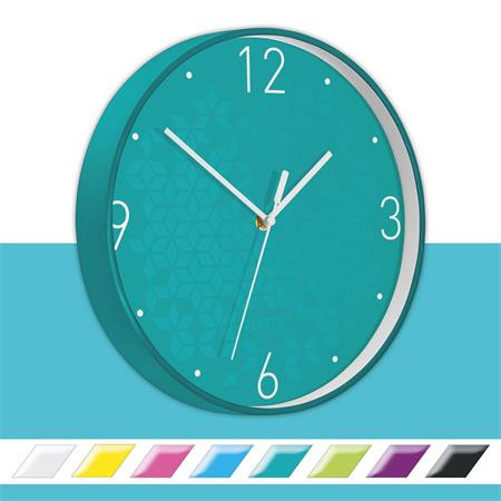 csendes és teljesen zajmentes kvarc óraszerkezet erős, kettős színhatású műanyag perem és üveg előlap WOW színű előlap geometriai mintázattal és nagy számokkal 3 fehér mutatóval, melyek jól láthatóak a színes háttér előtt könnyen felakasztható, 29 cm-es átmérő 1db AA elemmel működik (a csomagolás nem tartalmazza)