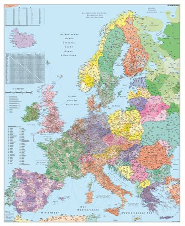 Falitérkép,100x140 cm, fémléces, Európa irányítószámos térképe, STIEFEL leírása