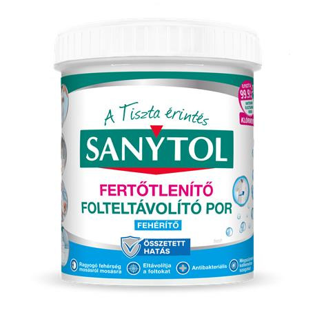 A Sanytol olyan fertőtlenítő folteltávolító port fejlesztett ki fehér ruhákhoz, amely hatékonyan távolítja el a makacs szennyeződéseket és elpusztítja a mikrobák 99,9%-át már 30°C-on. A termék egyedülálló, enzimeken és aktív oxigénen alapuló formulája mélyen behatol a szövet szálai közé és eltávolítja a szennyeződéseket, illatosítja a ruhákat, illetve visszaadja azok fehérségét. Ideális minden alsóneműhöz (fehérnemű, zokni, trikó, póló stb.), babaruhához, gyermekruhához (kezeslábas, partedli, nadrág stb.), ágy- és asztalneműhöz (törülköző, konyharuha, lepedő stb.).