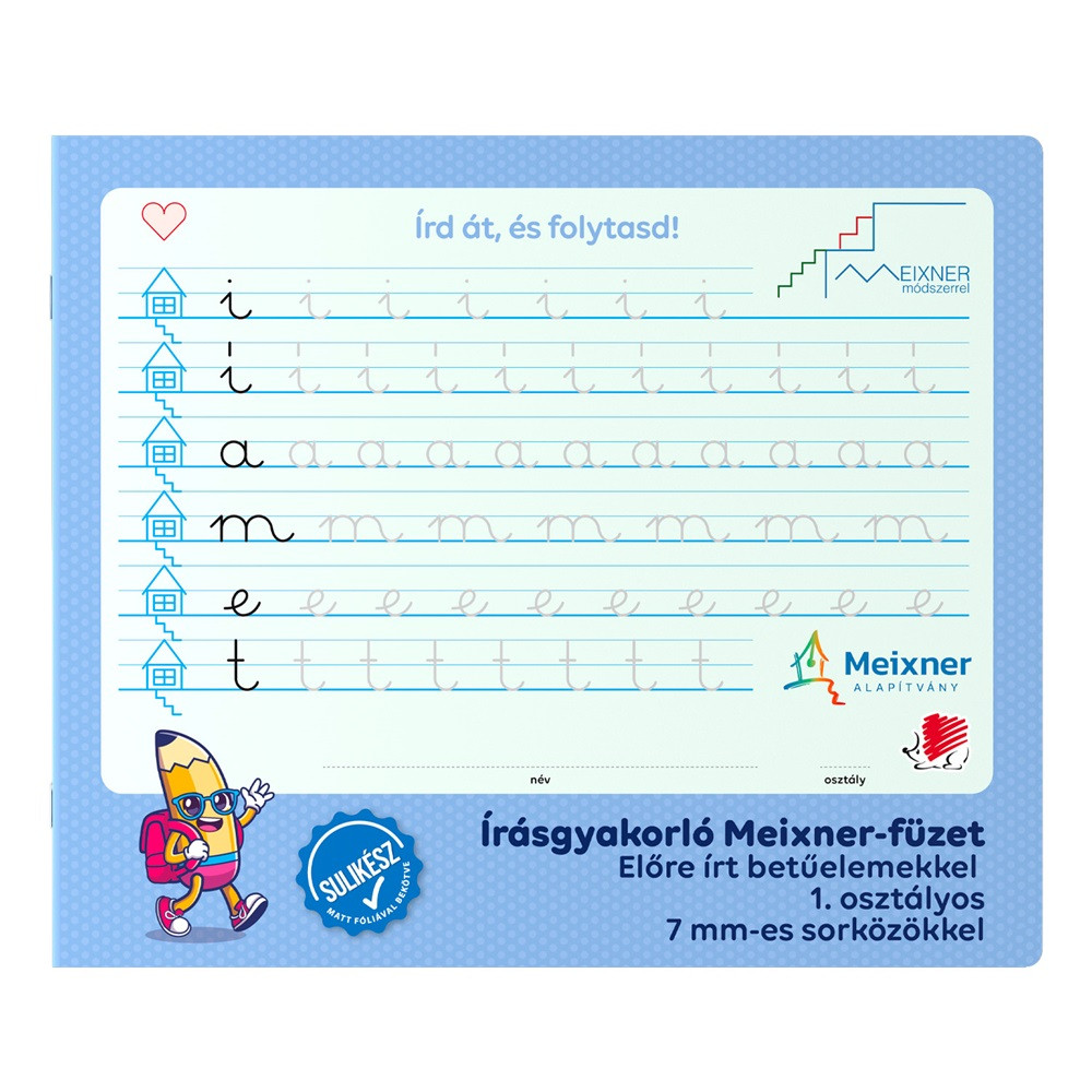 Írás gyakorló füzet előre írt betűelemkkel és betűkkel az 1. osztályosok számára, amely a Meixner Alapítvány együttműködésével és ajánlásával jött létre. Speciális vonalazású és kialakítású füzet alkalmas a Meixner-féle írás tanulás elsajátítására és gyakorlására.