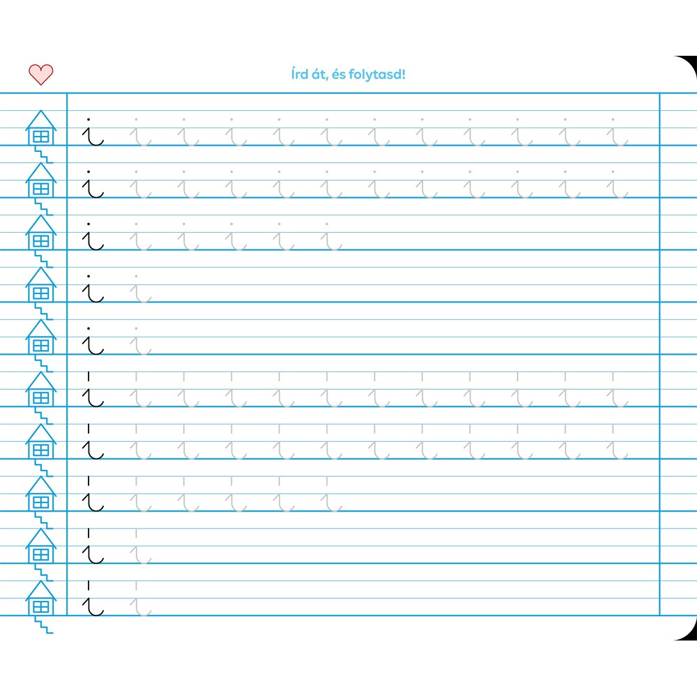A házikó megkönnyíti a vonalközben való tájékozódást, a szívecske a balról jobbra haladást. A nagyobb – 7 mm-es – vonalközök elég helyet hagynak az első betűk megformálásához. A füzet előre írt írásmintákkal segíti a helyes betűformák és kötések begyakorlását a betűelemektől a betűkön keresztül. A füzet méretét a kisgyermekek testarányaihoz igazítottuk, amely 32 lapos, fekvő formátumú speciális méretű: 245*295 Mm. A sarkok kerekítettek és a füzet SULIKÉSZ; matt fóliával van bevonva. 10 db/csomag. Katalóguskód: 67388