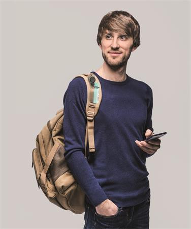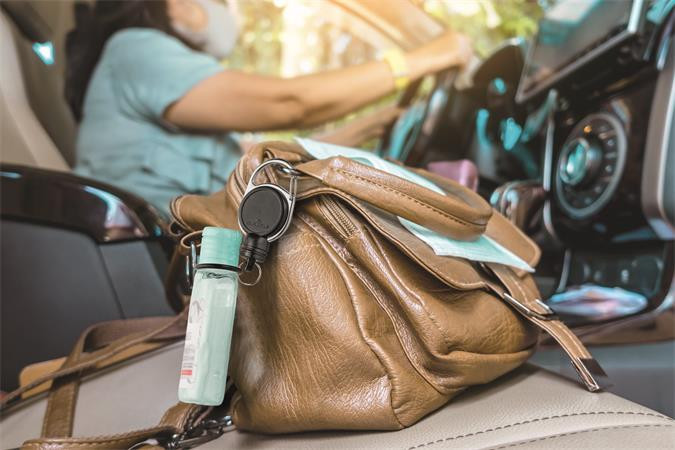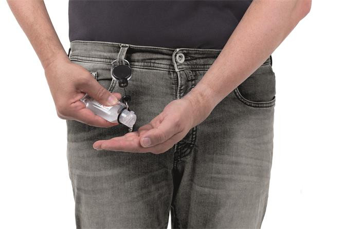 Kihúzható kézfertőtlenítő-tartó karabínerrel.