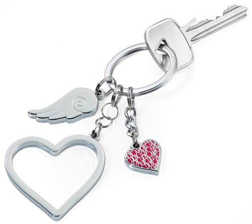 -kulcstartó 3 charm dísszel, szív (nagy), szív (kicsi), szárny