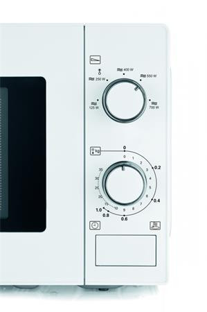 Szabadonálló mikrohullámú sütő - 20 literes kapacitás - teljesítmény: 700 Watt - kivehető forgótányér - 35 perces időzítő hangjelzéssel - 5 teljesítmény fokozat - mechanikus vezérlőgombok - melegítés, kiolvasztás - fehér kivitel