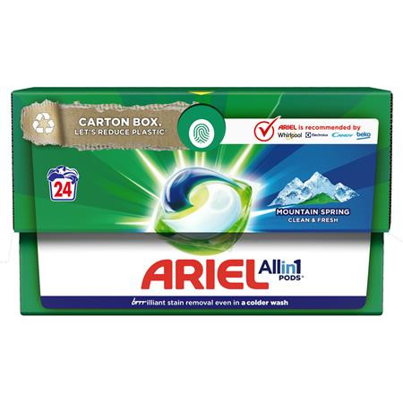 Az Ariel Allin1 rendkívüli tisztítóhatást nyújt, mindössze egyetlen apró kapszulába sűrítve. Az Ariel Allin1 PODS Mountain Spring mosókapszulák különleges, többrekeszes kialakítása stabilan, elkülönítve tárolja a hatóanyagokat a mosás kezdetéig, így szuperkoncentrált tisztítóhatást nyújtanak.