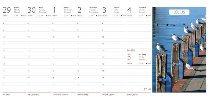álló formátum tömb mére: 320x150 mm lap típusa 115 g, fehér ofszet időbeosztás: félórás, 7-17.00 h hátlap anyaga fehér karton magyar naptárháló