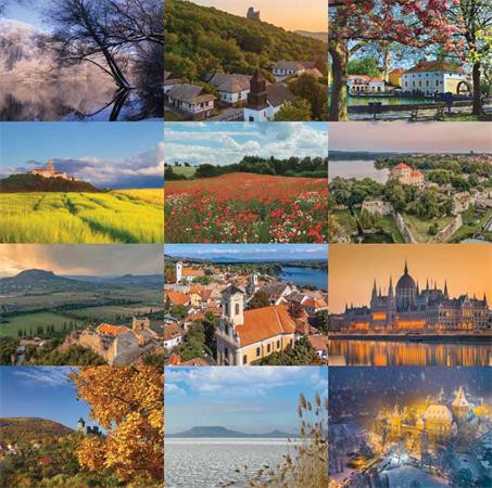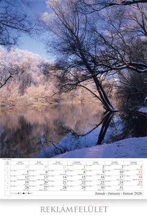 -naptár rész: magyar, angol, német nyelven, magyar ünnepek és névnapokkal, napkelte, napnyugta és holdállás feltüntetésével
