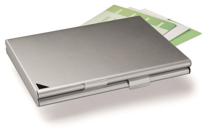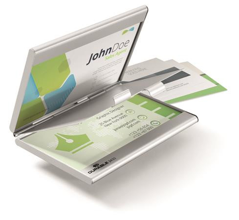 Elegáns, alumínium névjegykártyatartó, matt ezüst felülettel. -20 db névjegy tárolására alkalmas -max. 90 x 55 mm-es névjegyekhez -külső méretek: 125 x 67 x 8 mm (szé x ma x mé) -ezüst színű -alumínium Itt megtekinthető és letölthető a termékadatlap. Itt megtekinthető és letölthető a környezetvédelmi adatlap. Gyártó/első EU forgalmazó elérhetősége:  DURABLE Hunke & Jochheim GmbH & Co. KG Westfalenstrasse 77-79, D- 58636 Iserlohn, Germany info@durable.de www.durable.de