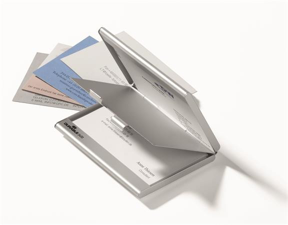 Névjegykártyatartó tárca, fém, 20 db-os, DURABLE "CARD BOX DUO", ezüst leírása