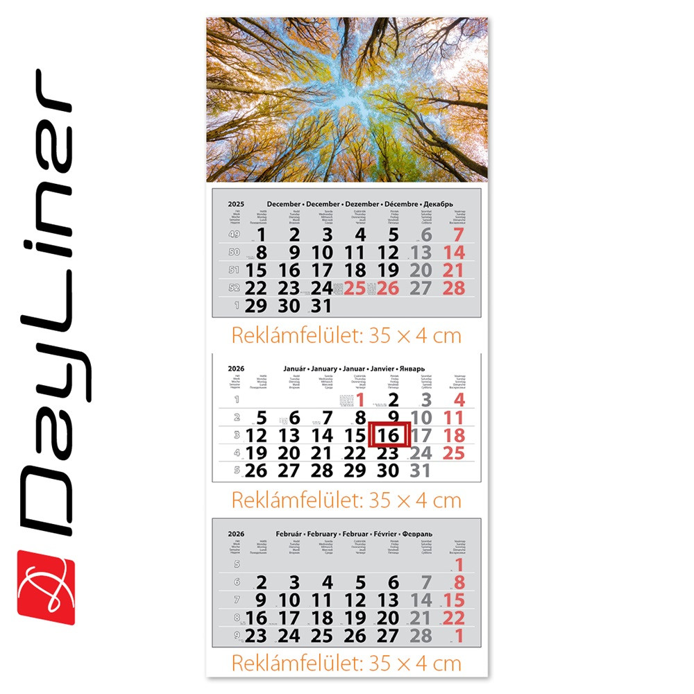 Speditőr naptár 3 tömb, 3 hónap Maxi Classic 350 × 820 mm, fehér lapokkal Erdő Dayliner 2026.