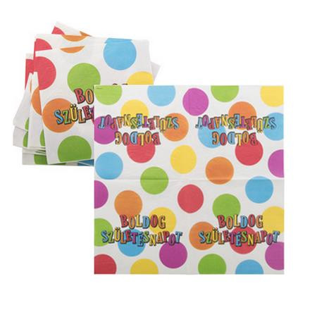 Szalvéta, 33x33cm, "Boldog születésnapot", csíkos-pöttyös leírása