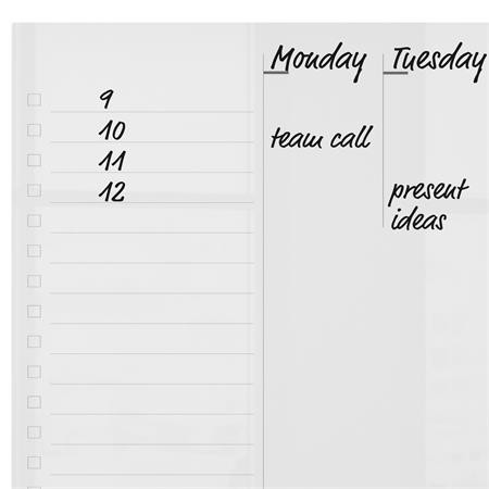 Ez az otthoni irodai, heti tervezőtábla a modern, keret nélküli kialakításnak és heti beosztású rácsozásnak köszönhetően ideális jegyzeteléshez, gondolatok, ötletek, fontos dátumok feljegyzéséhez A ragasztópárnák és mágnesek segítségével fém felületekhez rögzítve falitáblaként, vagy asztalra és egyéb munkafelületre fektetve asztali fehértáblaként is használható. Az átlátszó kialakításnak köszönhetően az emlékeztető tábla használaton kívül észrevetlenül beleolvad a környezetébe. Szárazon törölhető felülete könnyen tisztán tartható, egyszerűen írjon rá, törölje le és kezdheti elölről. Tartozék: 1db táblatoll. Méret: A4.