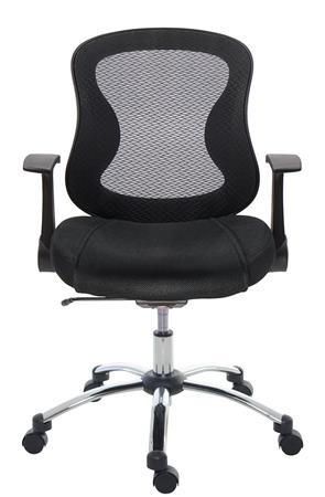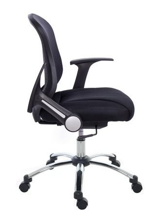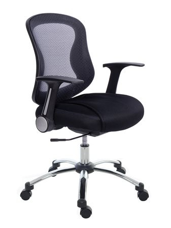 innovatív menedzserszék vastag, párnázott szivacsozással az ülőfelületen komfortos kialakítással, ergonomikusan formázott háttámlával gázliftes magasságállítás fix háttámla magasság testsúlyhoz alkalmazkodó szinkronmechanika kárpit: ülőfelületen: mesh háttámla: feszített hálós szín: fekete felhajtható karfával szállítjuk krómozott láblereszttel teherbírás: 130 kg méretek: teljes magasság: 93-102 cm ülésmagasság: 46-56 cm ülésmélység: 51 cm ülésszélesség: 50 cm