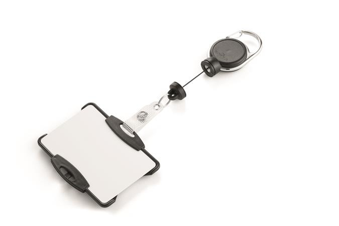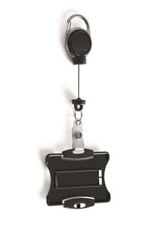 Azonosítókártya-tartó, kihúzható, karabineres, DURABLE "Extra strong", kártyatartóval, fekete leírása