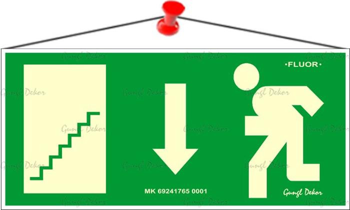 Információs tábla, 25x11,5 cm, fluoreszkáló, utánvilágítós, "Menekülési irány le, lépcső balra" leírása