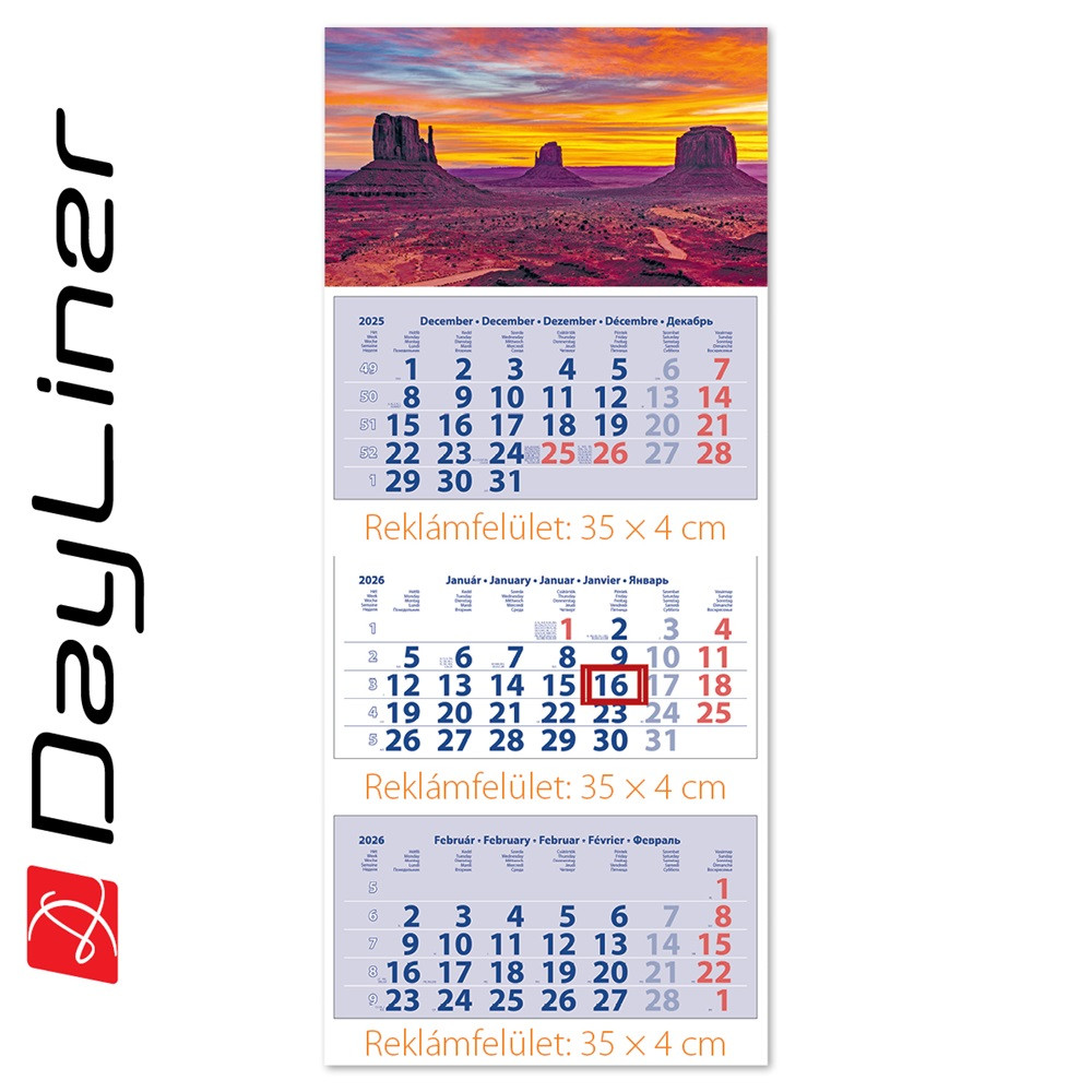 SPEDITŐR NAPTÁR 3 TÖMB, 3 HÓNAP MEDIUM CLUB 350 × 755 MM, FEHÉR LAPOKKAL HANGULAT DAYLINER 2026.