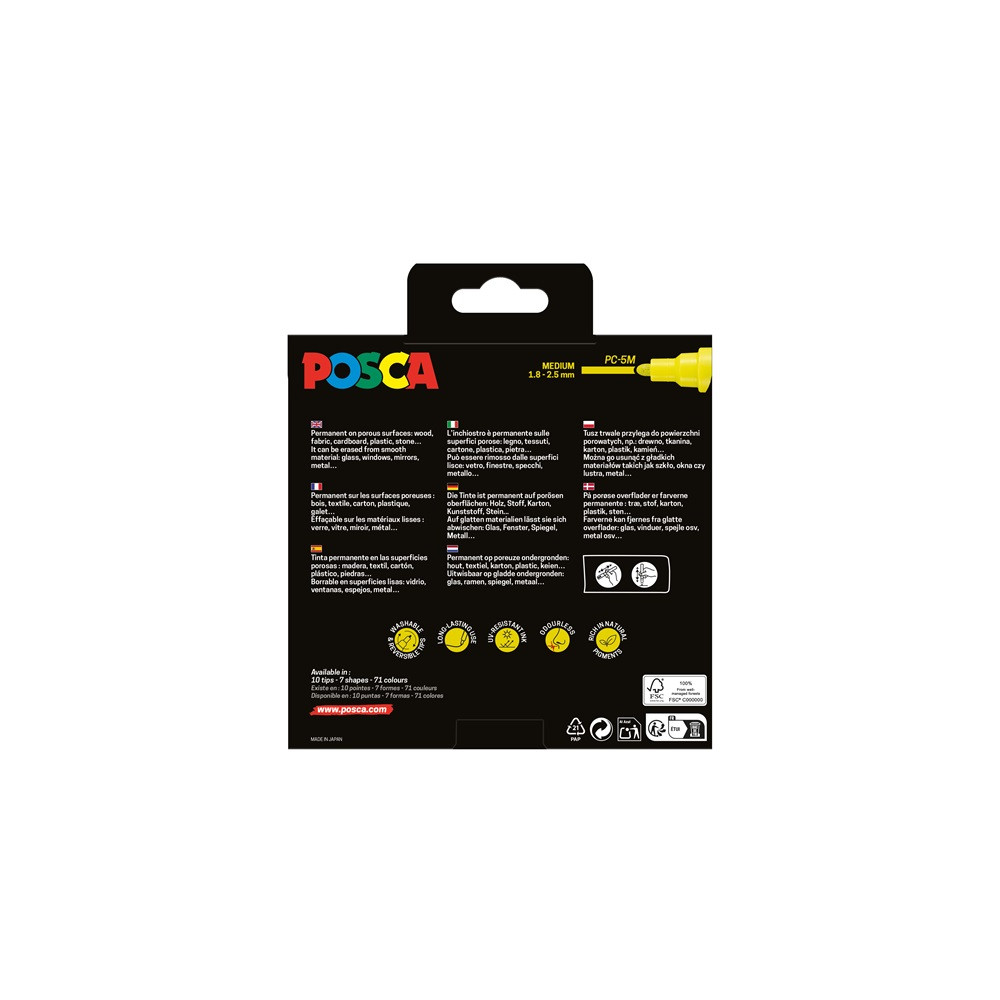 A POSCA vízbázisú markerek szinte minden felületen használhatóak. Tartós vagy félig tartós eredményt biztosít a felületektől függően. Festéke pigmentekben gazdag, egyedülállóan telt színek jellemzik, amelyek ellenállnak az idő múlásának. A vízbázisú festék szagtalan, rétegezhető, keverhető és vízben oldódó. A POSCA markerek tökéletes eszközt jelentenek művészeknek, grafikusoknak, designereknek és lényegében bárkinek kreatív tevékenységekhez.