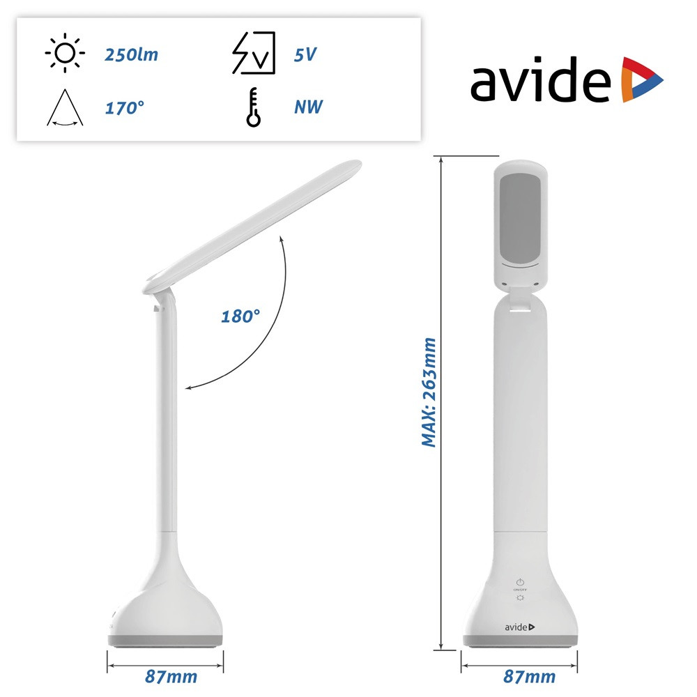 Az Avide LED Asztali Lámpa RGB Hangulatvilágítással modern és praktikus világítási megoldás otthonra vagy irodába. A 4W teljesítményű, energiatakarékos LED fényforrás 250 lumen fényerőt biztosít, miközben a beépített RGB hangulatvilágítás különleges atmoszférát teremt bármilyen környezetben. Az érintésvezérlő panelnek és a beépített akkumulátornak köszönhetően kényelmesen használható, a minimalista fehér design pedig könnyen illeszkedik bármely enteriőrbe.